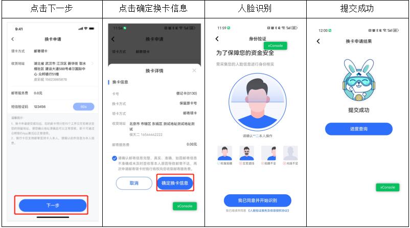 (2)储蓄卡详情页->点击换卡申请->进入换卡申请页->点击“进度查询”按钮(如图五)。